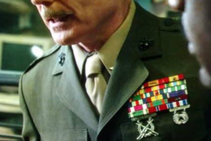 PHOTO - Two examples of improper and/or incorrect uniform details (above and below) from the same film and same character from different scenes. In the upper photo the US Marine Colonel has six rows of correct ribbons on his uniform, BUT they are completely upside down and backwards of the correct order. Also his shirt collar rank devices are placed incorrectly (far too low). While in the photo below, the same actor/character is now wearing only five rows of ribbons, which are same four ribbons repeated over and over in a different order (some which are incorrect for an officer to be wearing), and he oddly now has Marine Para jump wings (above ribbons) suddenly a Photo courtesy: out take from a recent TV Docudrama mini-series.
