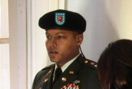 PHOTO - Another actor (above), portraying a U.S. Army officer, wearing the standard issue black beret (post 2001) . Note the poor sloppy un-shaped look of the beret and the sizing draw cord hanging down in the back. Photo courtesy: A recent TV movie.