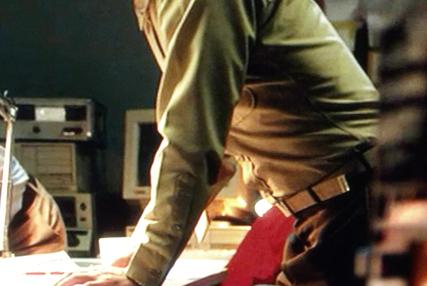 Two examples (above and below) from the same film which show wardrobe failures and/or uniform mistakes. In the photo above, the Marine officer has his trouser belt far past regulation length. In the photo below, his cloth uniform belt is inside out, and improperly secured. Also his Pistol Expert badge is folded and stuck up under the ribbon bar, which is again upside down and backwards, and his shirt collar rank is either improperly placed or completely missing. All which could be corrected by someone that knows better, in less then five minutes. This is why we have "Last Looks" in the film industry. Photo courtesy: from a recent TV Docudrama mini-series.